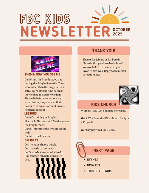 The FBC Kids discipleship class is designed to help kids grow in their walk with Jesus. We will learn about salvation, baptism, communion, tithing, worship, prayer, service, and sharing Jesus. We offer two sessions per year - about 12 weeks each. Each child that attends regularly will have gone through variations of this class four times by the time they promote to 7th grade.